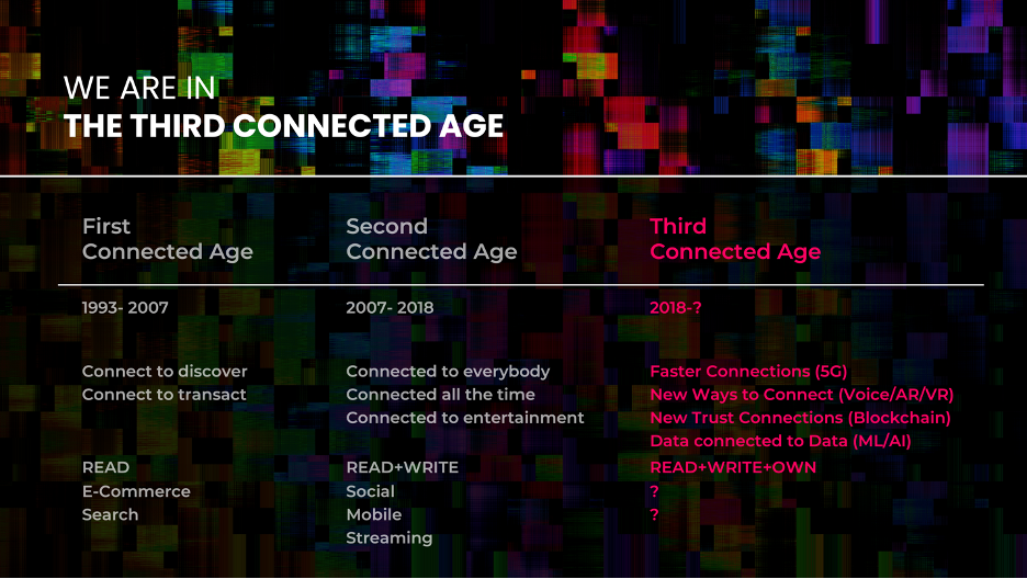 In 2007 we entered the Second Connected Age where we were connected to everybody, all the time and to entertainment which gave rise to social, mobile and streaming. We consumed and created content but much of the value created was captured by the platforms rather than the content creators.