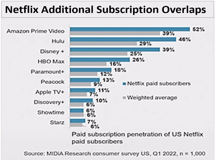 Are there too many streaming services? In addition to Netflix, there's Hulu, HBO Max, Amazon Prime Video, Peacock, Paramount+, Disney+, Apple TV+, ESPN+, not to mention the FAST (Free Ad Supported Services) such as Tubi, Roku Channels, Samsung TV Plus, LG Channels, etc. One concern is audience overlap. As Laura Martin, Senior Analyst and General Manager with Needham & Co pointed out in her “state of streaming” keynote, “a huge percentage of Netflix subscribers not only have cable, 52% of them also have Amazon Prime, and 46% also have Hulu.